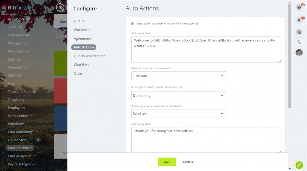 Mark enquiry as unanswered in – specifikuje časový interval, po jehož uplynutí bude dotaz označen jako nezodpovězený. Pokud žádný zaměstnanec nemůže na dotaz odpovědět, můžete nastavit automatickou odpověď nebo určit že nemá být provedena žádná akce.